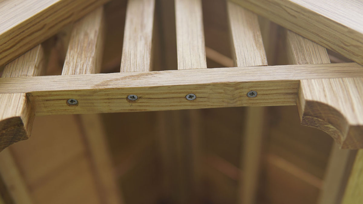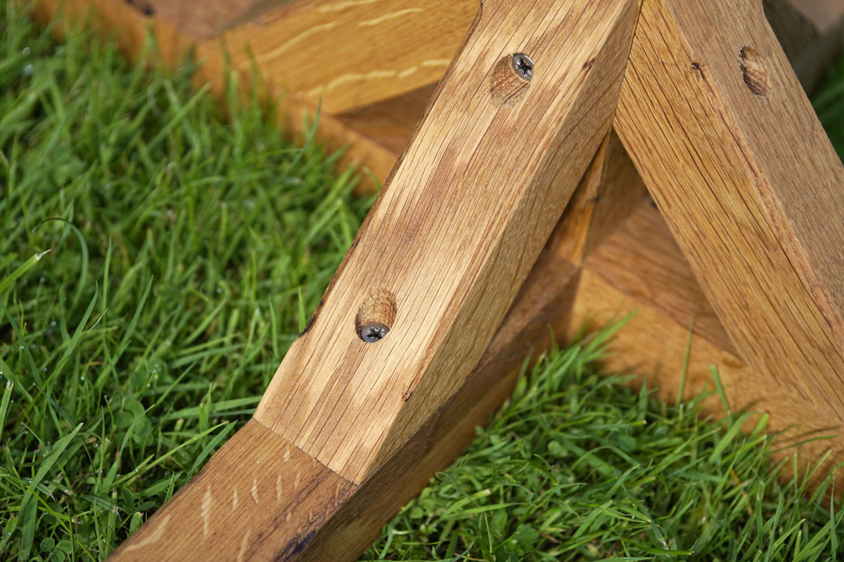 Joints are dowelled with oak, the glues are waterproof, and all screws are made of non-corroding stainless steel. The foot pads at the tips of the solid oak stand are tough weatherproof acrylic block.